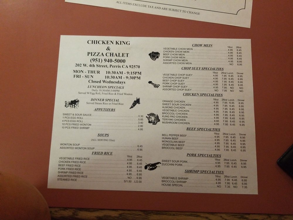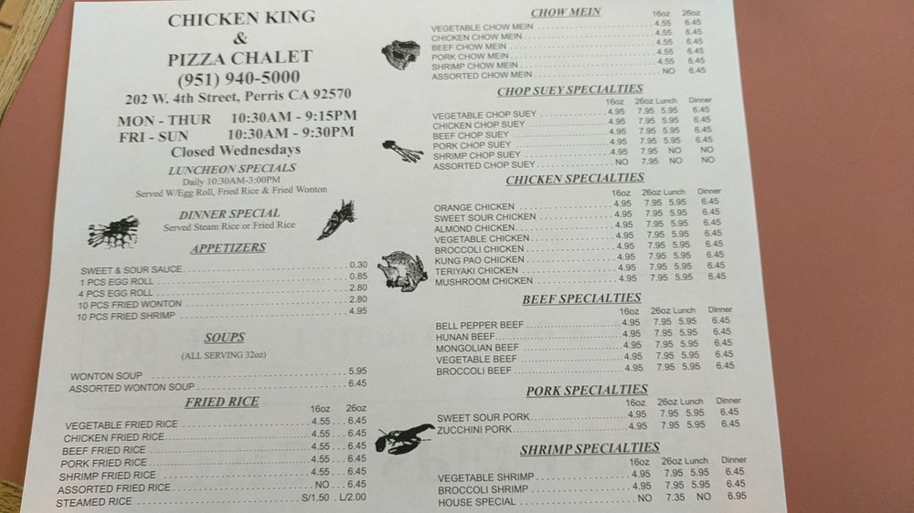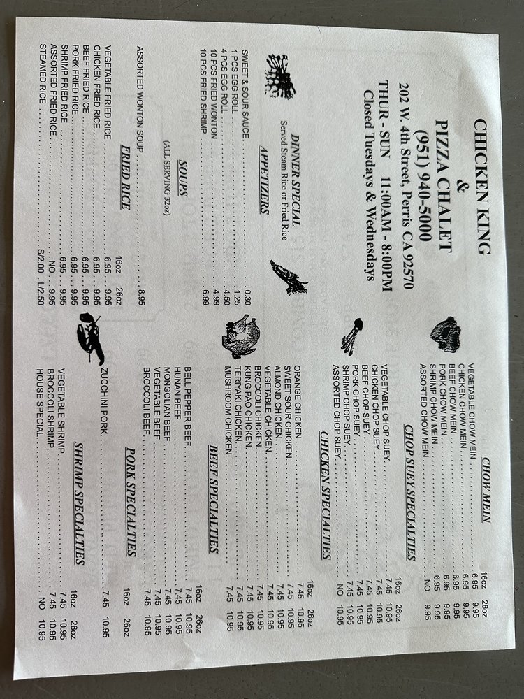 Nestled in the heart of Perris, CA, Pizza Chalet offers an enticing blend of pizza and Chinese cuisine, making it a standout destination for food lovers. Their menu features a variety of mouthwatering options, from crispy 10 Pcs Fried Wonton and savory Egg Rolls to delicious Sweet and Sour Chicken. Hungry patrons can explore unique specialties, including Broccoli Shrimp and House Special Shrimp, enhancing the culinary experience.